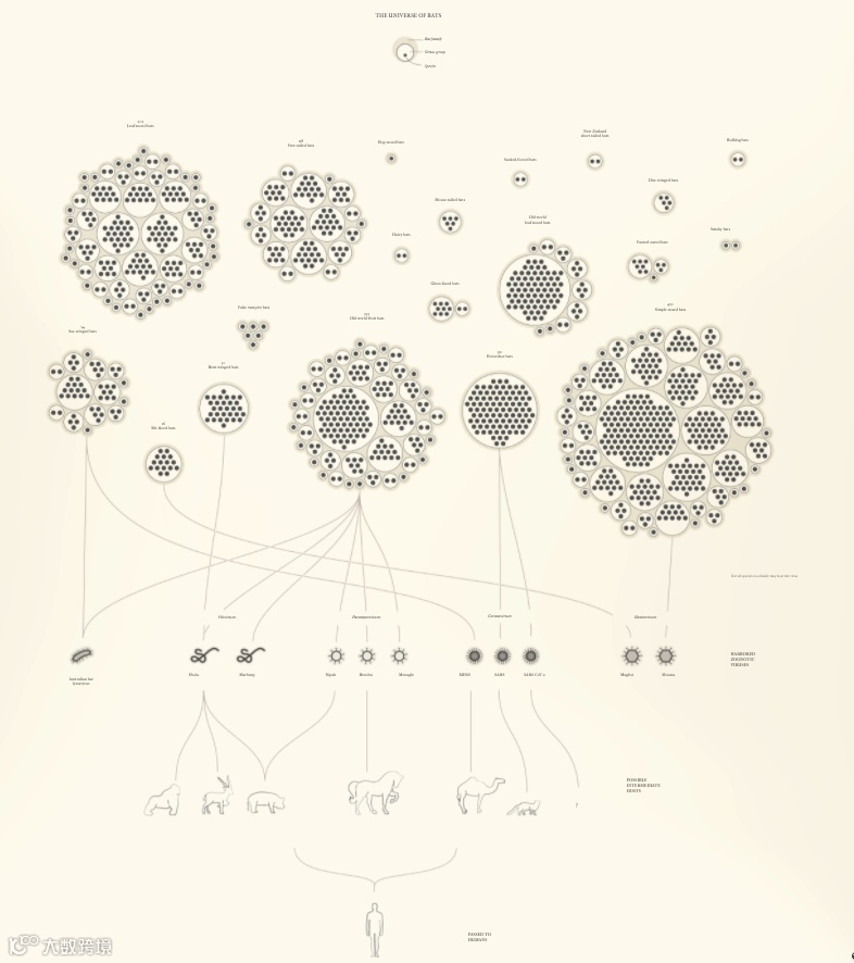 在过去的两年里,新冠疫情极大地影响了数据可视化创建者。路透社创建的这个流程图展示了病毒如何从不同的蝙蝠物种传播到其他动物,然后再传播到人类。