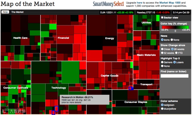 华尔街投资者一直在寻找在竞争中获得优势的方法。SmartMoney提供了一个所谓的“市场地图”,让任何人能同时追踪500多只股票,并进行可视化。树图可视化很简单:绿色表示股票上涨,红色表示股票下跌。