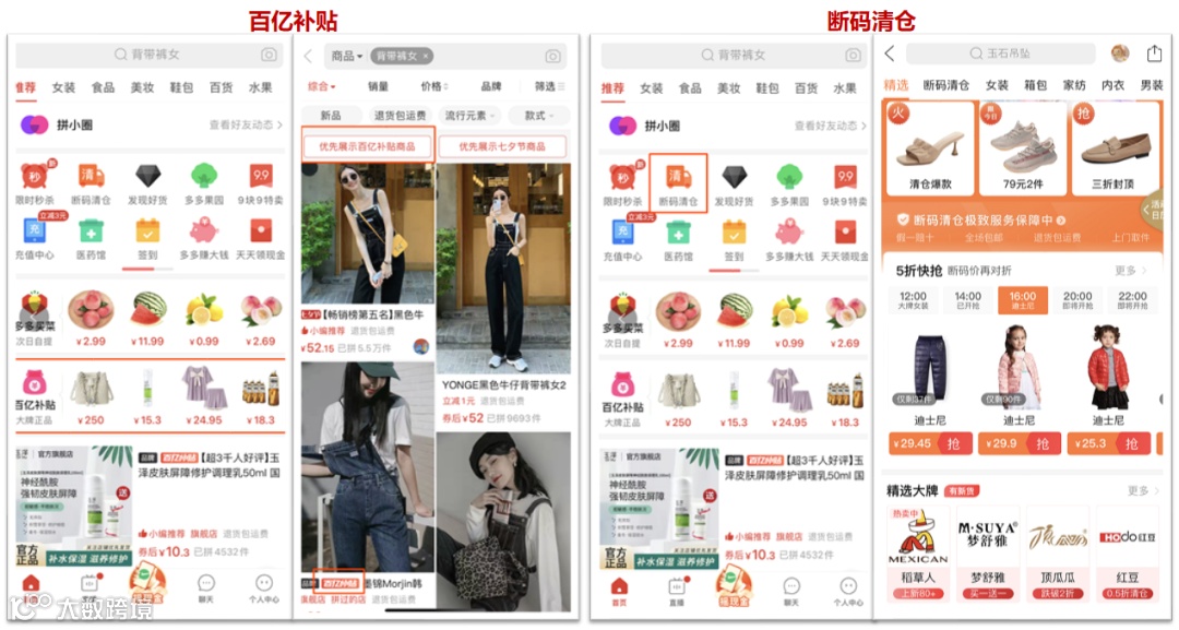 断码清仓——首页固定第2个icon频道,至少数百万点击,定位拼多多的【奥特莱斯】,服饰类非标品心智极强!