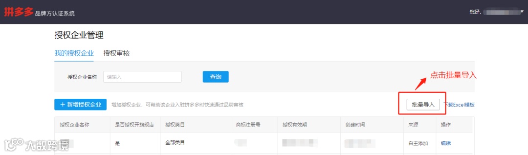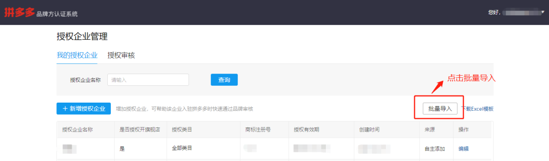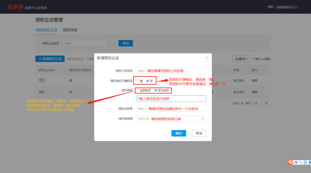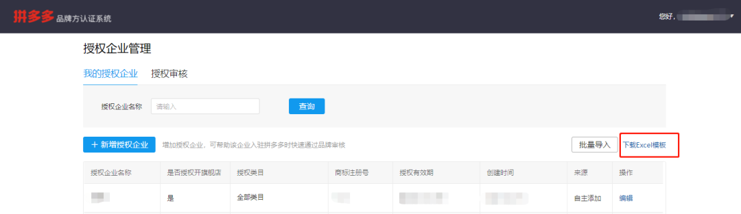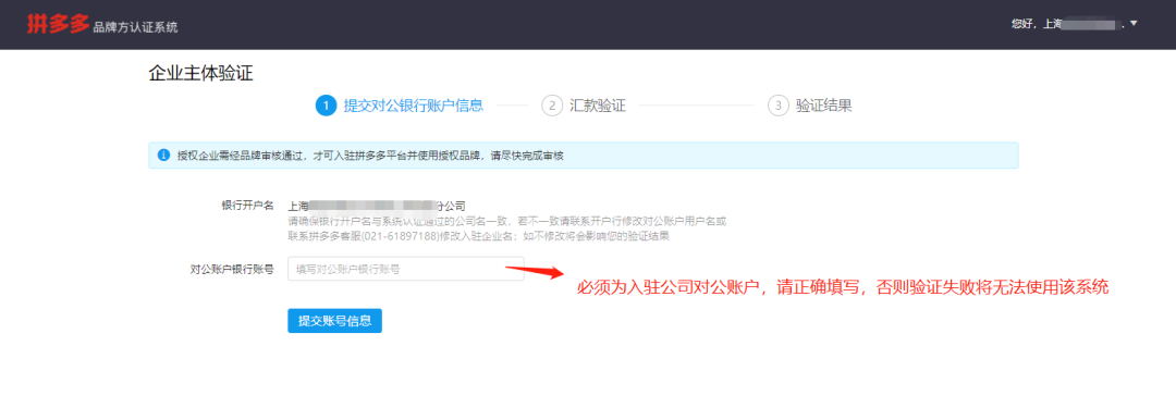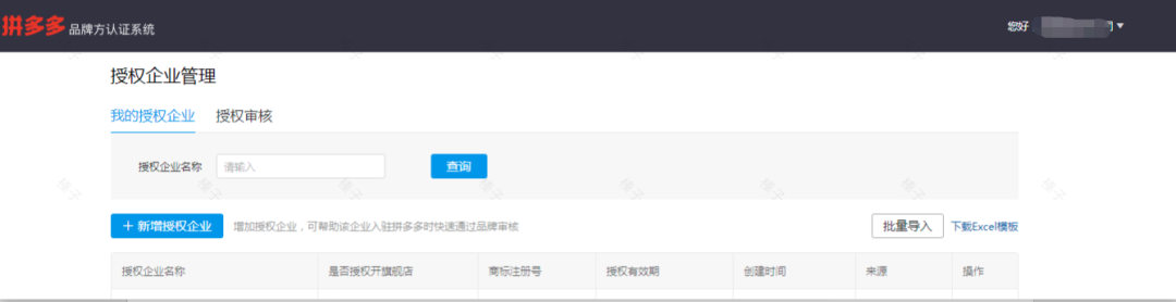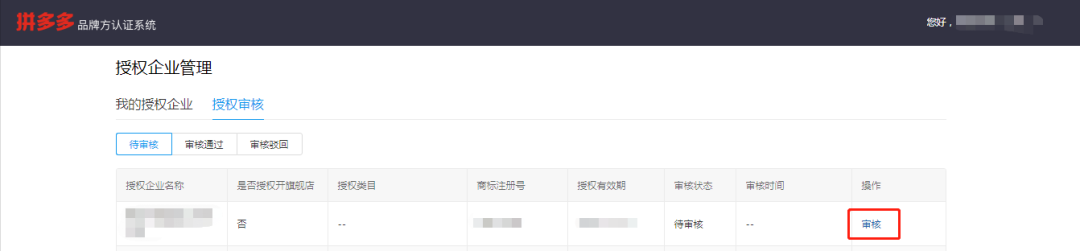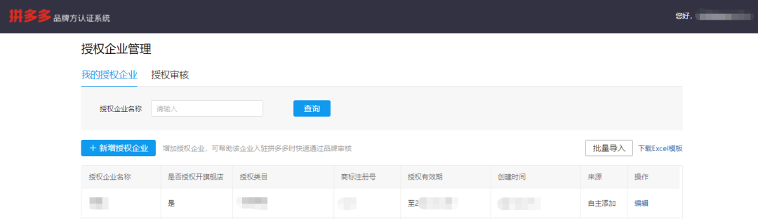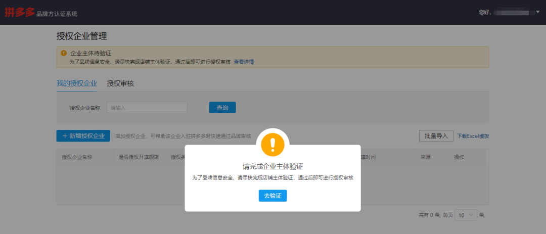 拼多多品牌方认证系统必须完成对公验证后才可进行授权审核,请务必先完成对公验证,否则自主添加授权公司信息不生效,同时也不能对商家授权进行审核。