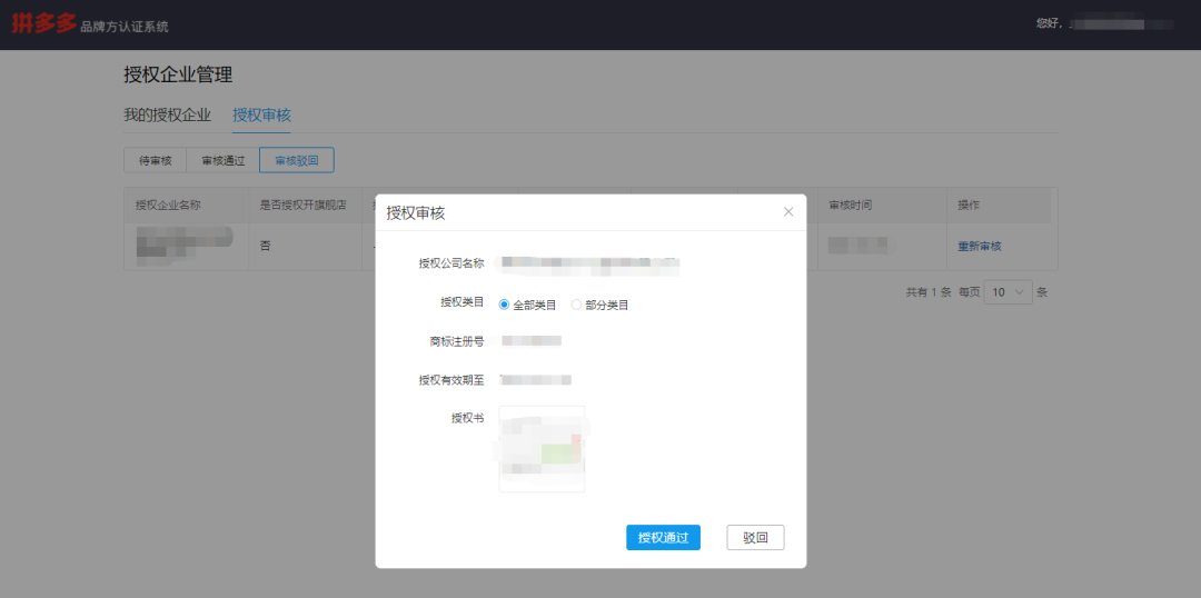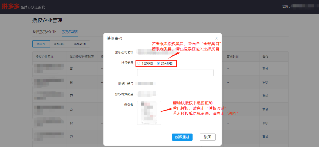 (3)查看授权书是否授权,若已授权请点击“授权通过”;若未授权或信息有误请点击“驳回”,如下图所示。