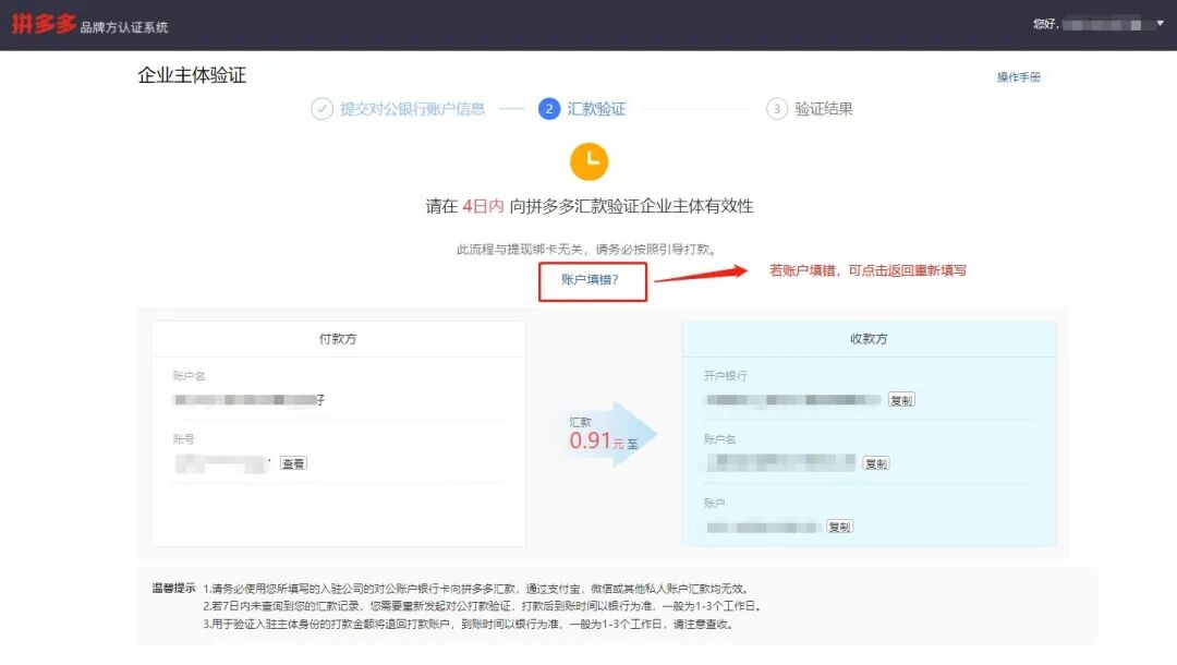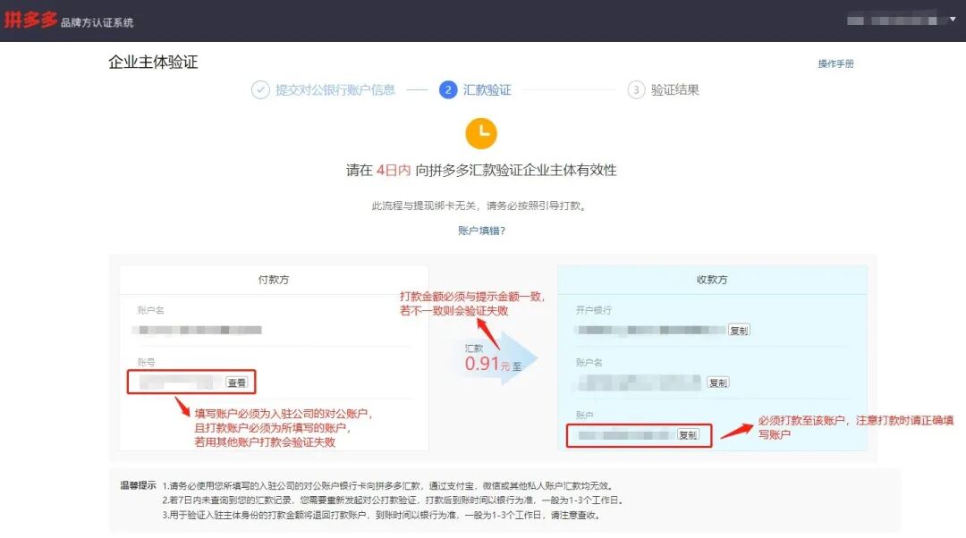 a.用于验证入驻主体身份的打款金额将退回打款账户,到账时间以银行为准,一般为1-3个工作日