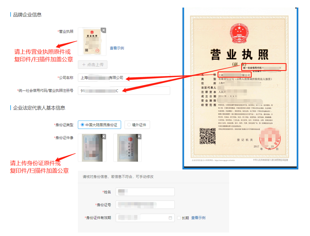 上传品牌方营业执照,法人证件并正确填写对应统一社会信用代码/营业执照注册号及法人身份证号码,确认无误后点击提交等待平台审核。若法人是境外人士,可上传护照、港澳通行证、台湾居民来往大陆通行证等材料,填写相关证件号码。