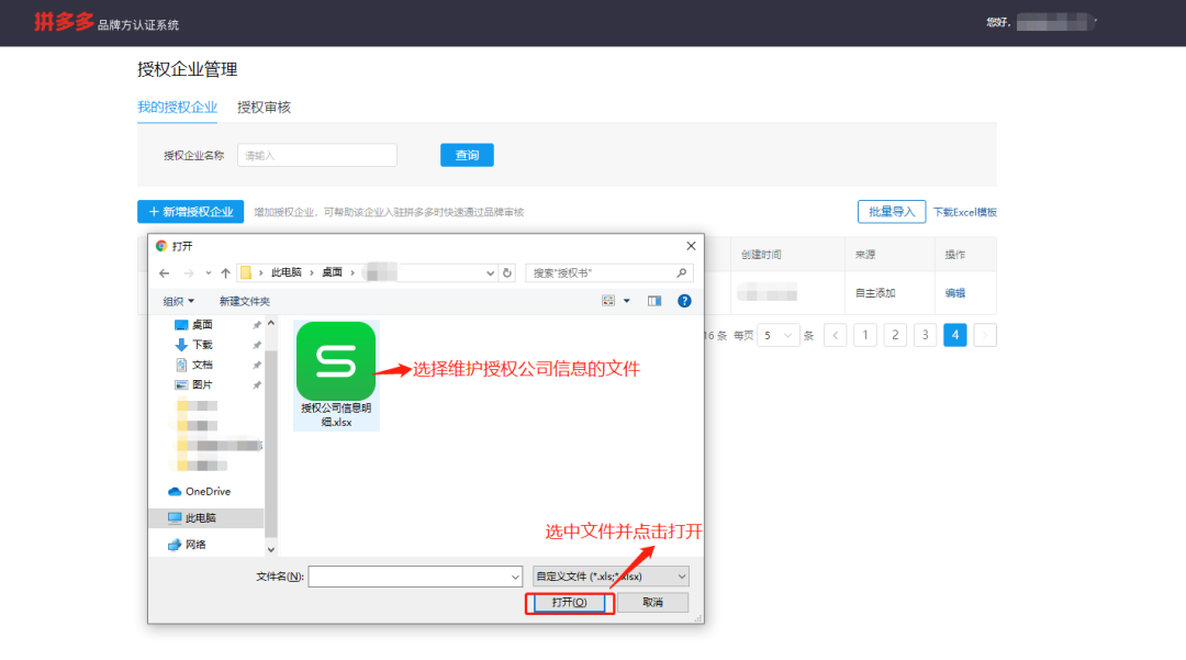 c.表格信息维护保存在电脑,点击批量导入,选择电脑中维护授权信息的表格,再点击打开即可,具体步骤如下: