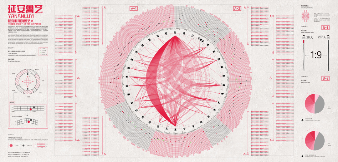 作者通过 121 篇学术论文以及大量来自不同时期的期刊报道,梳理出约 400 个鲁艺人的相关资料,来纪念鲁艺曾经发挥的力量。该系列中的多个信息图展现了不同时期鲁艺人的成就、去向和职业。