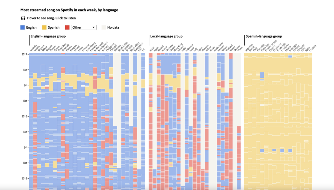 经济学人分析了 70 个国家或地区的 13,000 首音乐,追踪音乐品味和语言偏好的演变。