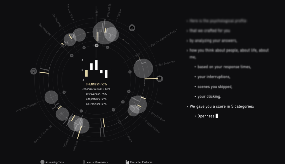 在观看这个交互视频的过程中,观众还可以探索这份数据集,并回答问题。在视频的最后,该网站还会记录和分析你的观看数据,包括回答问题的对错次数、鼠标移动速度、快进和暂停观看次数等,并试图分析观众的性格。