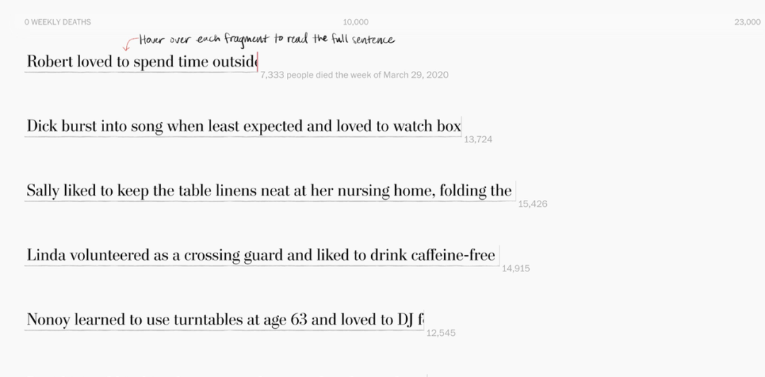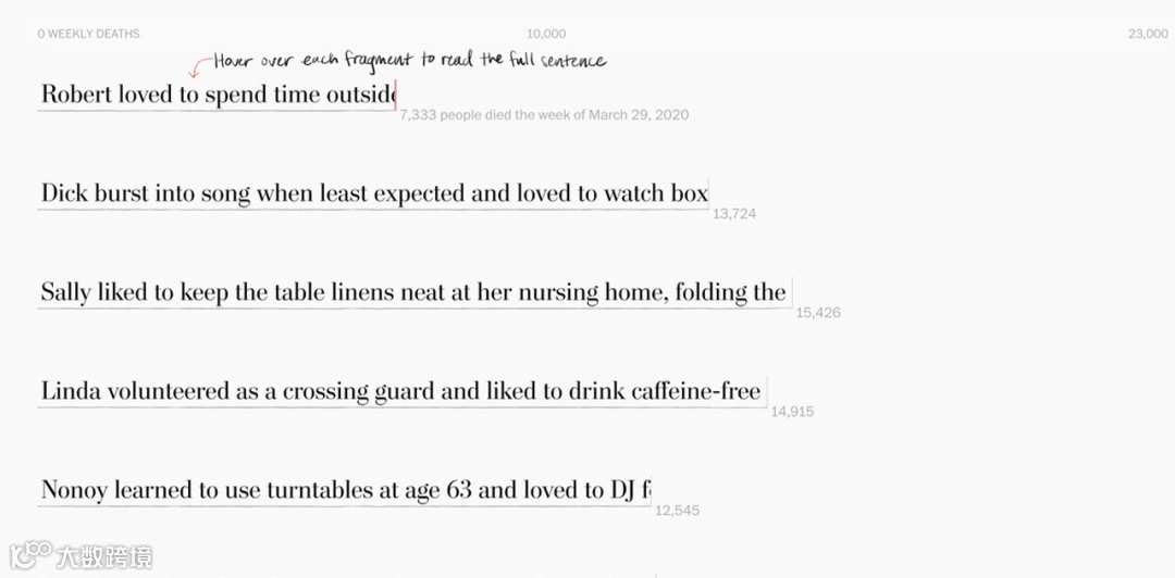 每个句子简单描述了当周某个死者的爱好、习惯等,句子中断的地方是按照不同周里的新冠死亡人数多寡来决定。