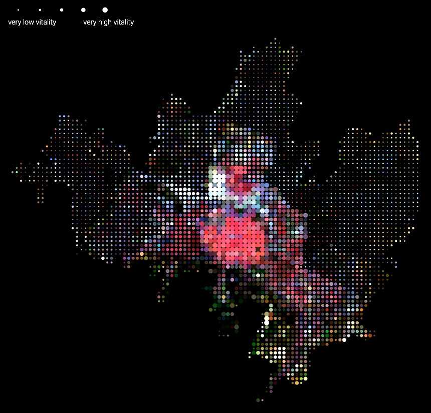 该项目通过深度学习框架,试图发现六个意大利城市里的活力地区。作者提取了 8,400 张小型卫星图像中的视觉元素,来赋予不同的分数,比如,红色屋顶或白色露台代表活跃的居民活动,相似的金属屋顶则代表无聊的工业建筑。