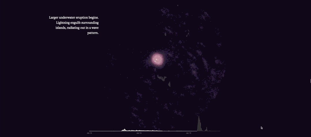 路透社使用了地面全球闪电探测网络的数据,来可视化汤加火山爆发期间的闪电活动。