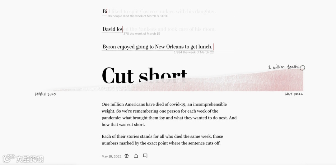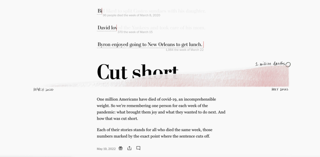 当 100 万美国人死于新冠疫情时,《华盛顿邮报》收集了 114 位美国新冠死者的生平,用可视化展现生命的突然中断。