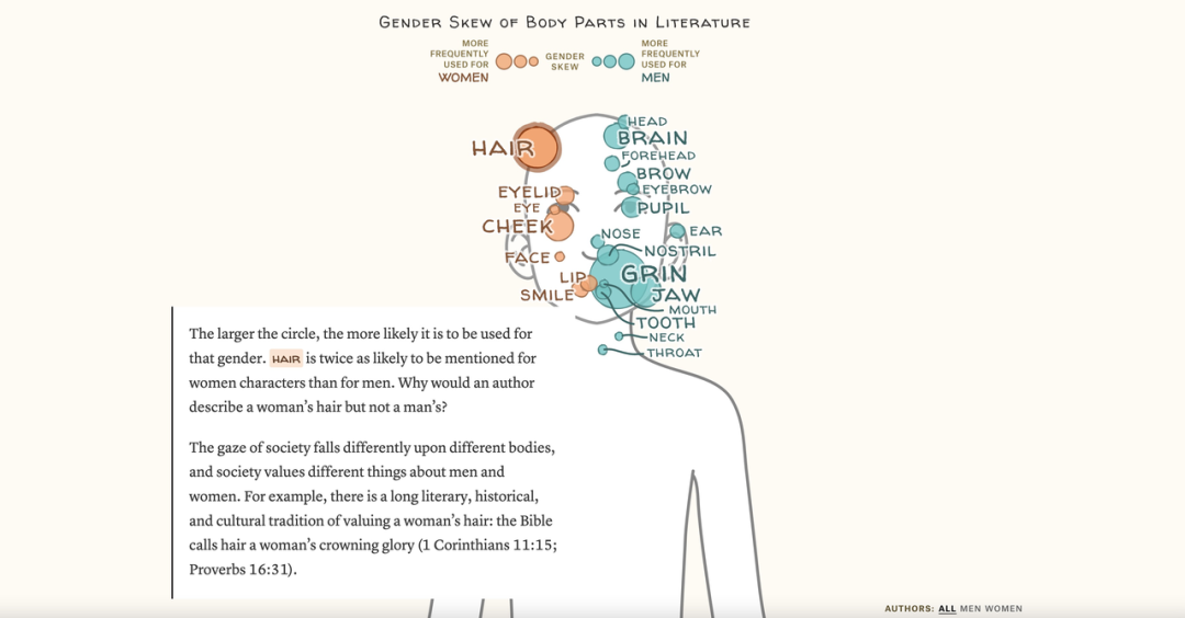 作者收集了 2,000 本书,对比分析其中对女性和男性的描述。在这些书里,提到的男性和女性的特定身体部位会不同吗?描述女性身体的形容词是否与描述男性的形容词不同?