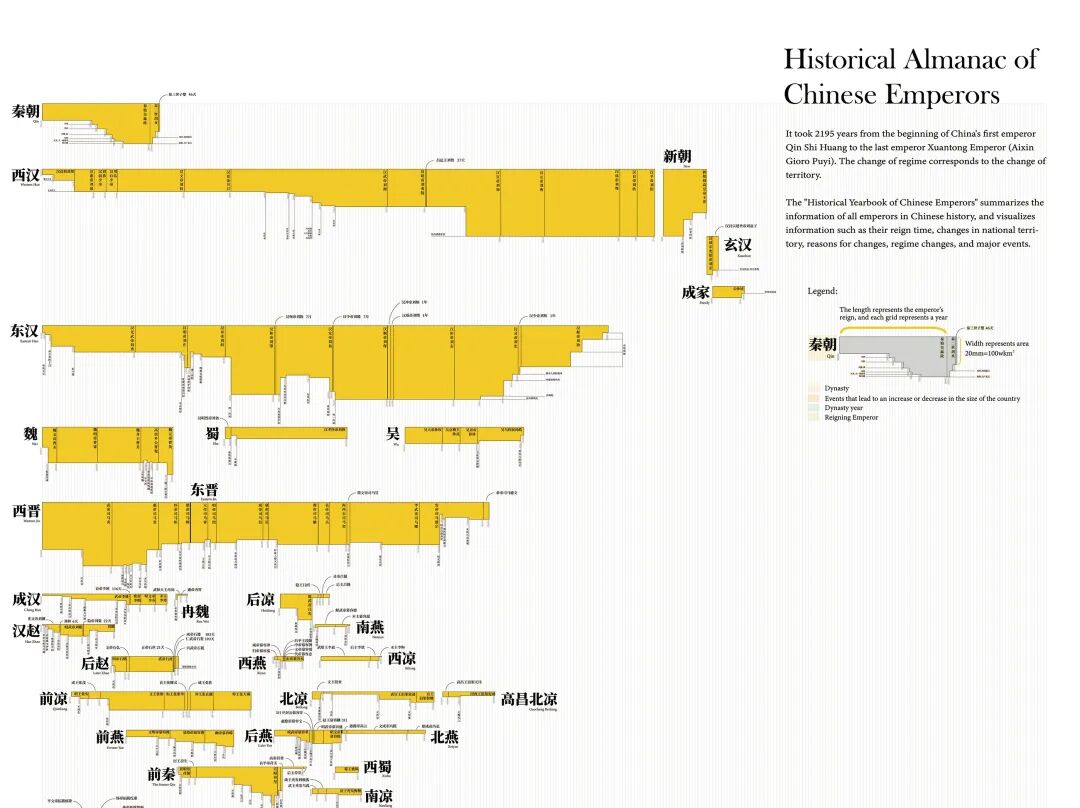 这一信息图收集了 2195 年里的皇帝相关信息,包括在位期间的疆域面积变化、变化原因、政权更替和执政时间,展示中国长达 2000 多年的独特历史。