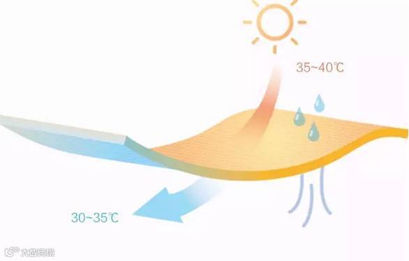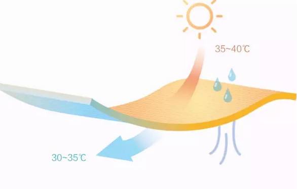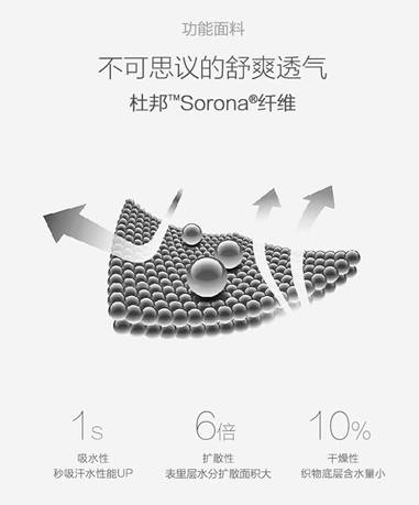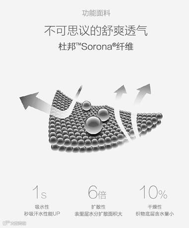 此次的T恤采用的是Sorona®纤维。一款来自美国杜邦公司的新型专利面料,据了解,这玩意儿是从天然植物中提取玉米醇衍生物组成的冰凉分子,可以通过相变吸收热量来调节纺织品温度,给人以凉爽的舒适感。一般穿上去,会有3~5度的温度降低感。