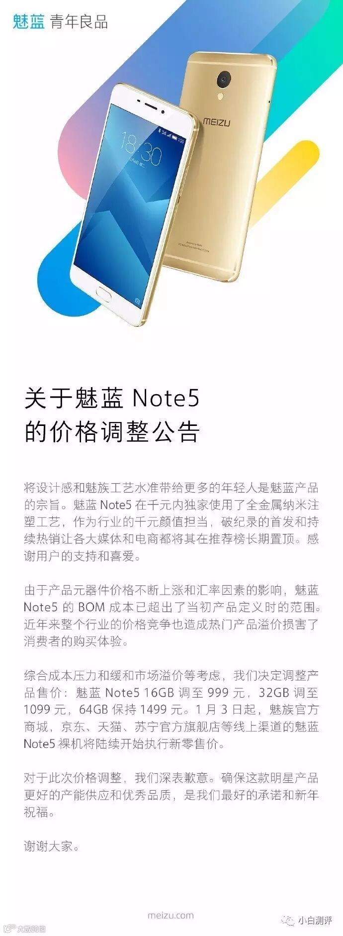 综合成本压力、缓和市场溢价等考虑,魅蓝Note 5实施调价,16GB涨至999元,32GB涨至1099元,64GB保持1499元不变(本月购买赠送EP-21HD耳机一副)。即日起,魅族官方商城、京东、天猫、苏宁等线上渠道都已开始执行新的零售价。那么,其他机型是不是也会涨价?其他厂商是不是也会涨价?