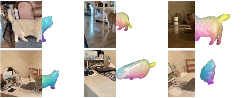 基于Meta的这项研究,你只需给定捕获可变形对象的任意视频,比如上传几个小猫小狗的视频,BANMo便可通过将来自数千张图像的2D线索整合到规范空间中,进而重建一个可编辑的动画3D模型,且无需预定义形状模板。