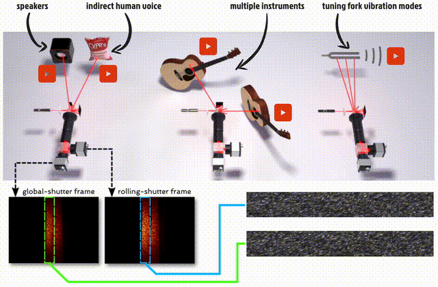 这篇获得CVPR 2022最佳论文荣誉奖的研究,提出了一种新颖的Dual-Shutter方法,通过使用「慢速」相机(130FPS)同时检测多个场景源的高速(高达63kHz)表面振动,并通过捕获由音频源引起的振动来实现。
