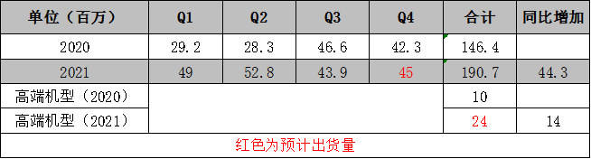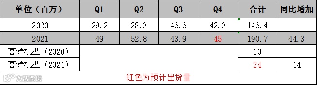 从数据中也可以大致推算出,预计2021年小米全年出货量1.9亿部,比去年全年增加4400万部,其中高端机型预计全年出货量2400万部,同比去年增加1400万,高端以下机型大概增加3000万部。不过可以看到的是,小米的高端机型占比也确实是在不断的上升之中。