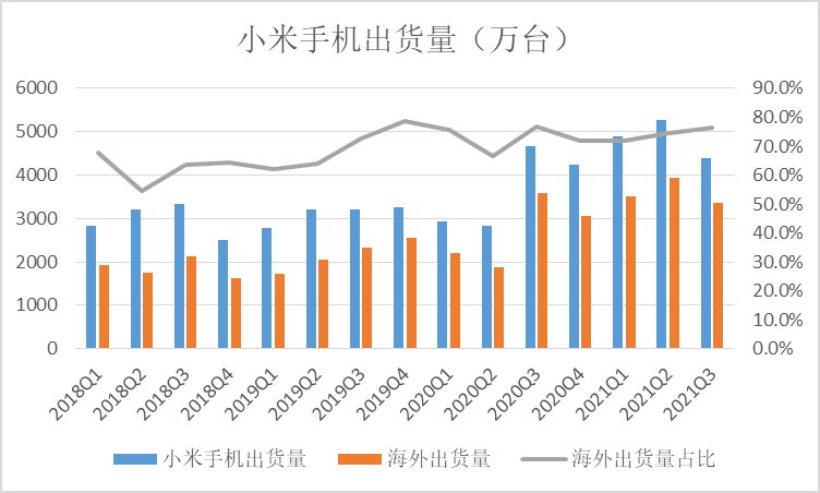 2017年是小米手机转折的一年, 这一年,小米迎来了公司战略的重大变革,在国内的智能机开始出现饱和的情况下,大力开拓全球化业务。统计数据显示,近年来小米的海外手机出货量不断升高,小米2021年第三季度海外市场出货量更是占了总出货量的76%,也就是说小米每卖出100台手机有76台都是卖向了海外。