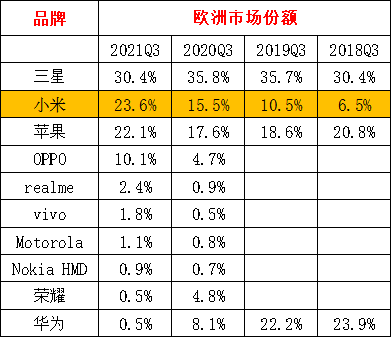 所以,小米在欧洲这两年在欧洲地区抢占的不仅是华为手机的份额,还包括三星的份额。虽然三星在欧洲占领第一大份额,但是欧洲地区人民对于手机品牌的忠诚度并不高,加上三星的中低端主要工厂在越南,越南地区去年收到疫情的巨大影响,三星手机的供应链也出现了一点问题。所以,在欧洲地区,华为受谷歌GMS的原因份额在降,三星的市场份额收到国内手机厂商的竞争也在下降,在欧洲基本各家都在增长的智能机市场中显得格外格格不入。