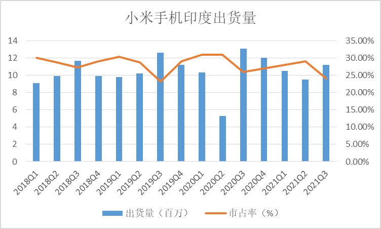 从渠道上看,印度约40%智能机通过线上渠道销售,但9 亿乡村消费者的互联网普及率仅33%,线下渠道同样不可忽视。过去以线上见长的小米则通过成立子品牌POCO和发力线下渠道,维持住了市场第一的销量份额。不过从三季度以来,市场在担心小米印度市场的下滑。从数据中也可以看到,小米在印度地区三季度出货量1120万部,同比下降了14.5%,是近四年来同期中出货量最少的季度。