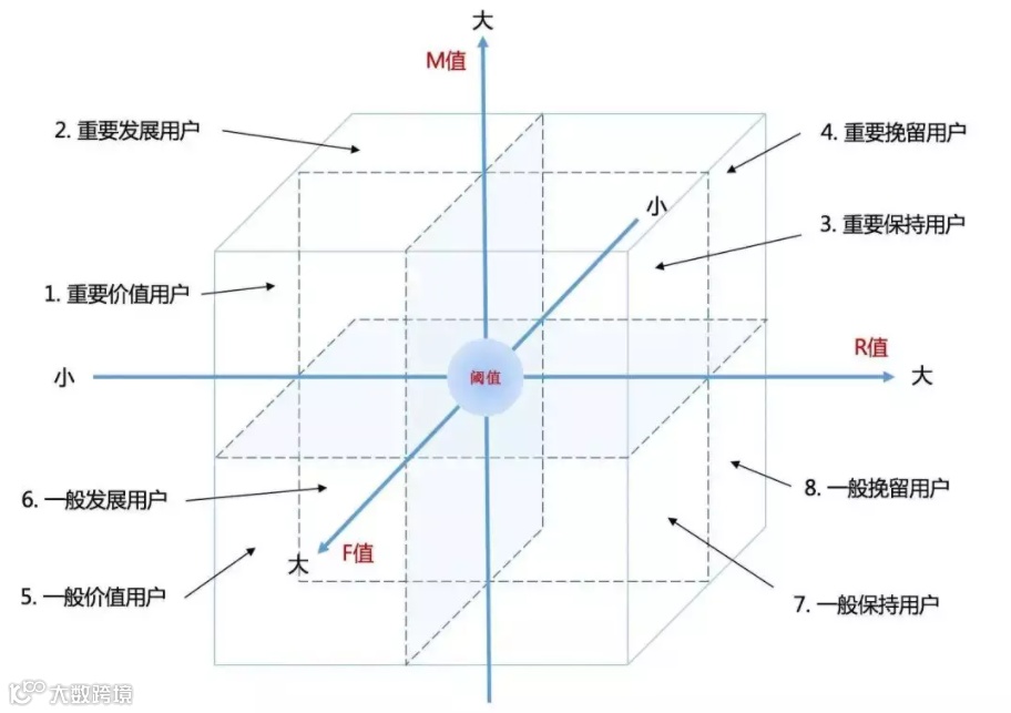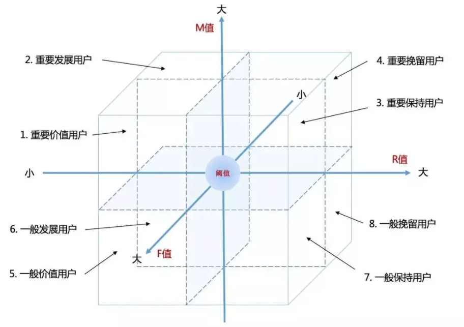 下面这个RFM模型就是利用象限法,将用户分为8个不同的层级,从而对不同用户制定不同的营销策略。