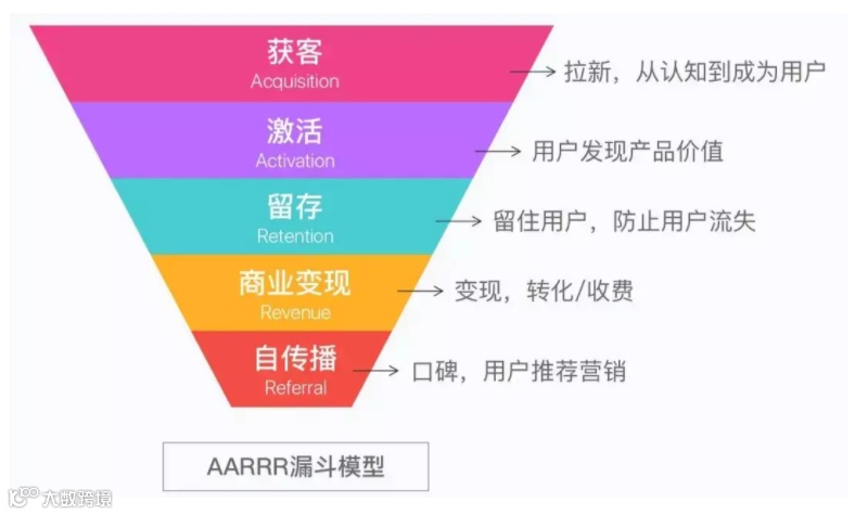 著名的海盗模型AARRR模型就是以漏斗模型作为基础的,从获客、激活、留存、变现、自传播五个关键节点,分析不同节点之间的转化率,找到能够提升的环节,采取措施。