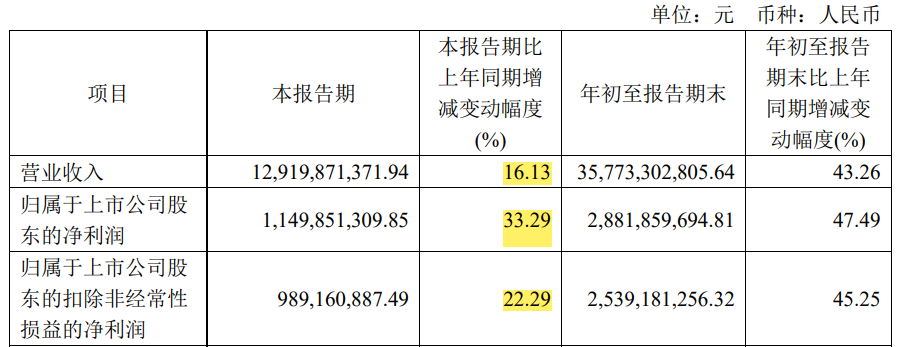根据公告数据,公司前三季度营业收入357.73亿 ,同比增长43.26%,扣非净利润11.5亿,同比增加47.49%。收入端表现一般,利润端表现十分亮眼。