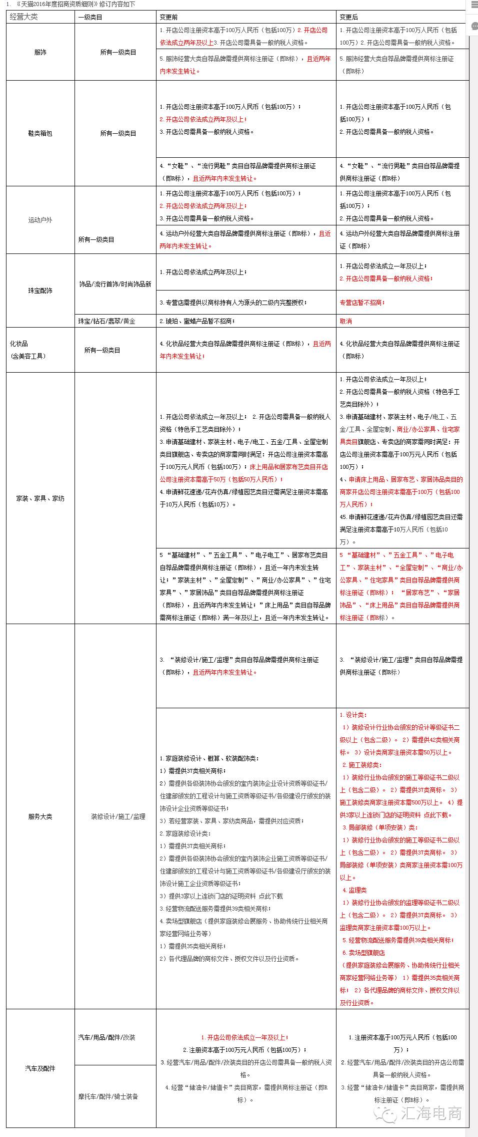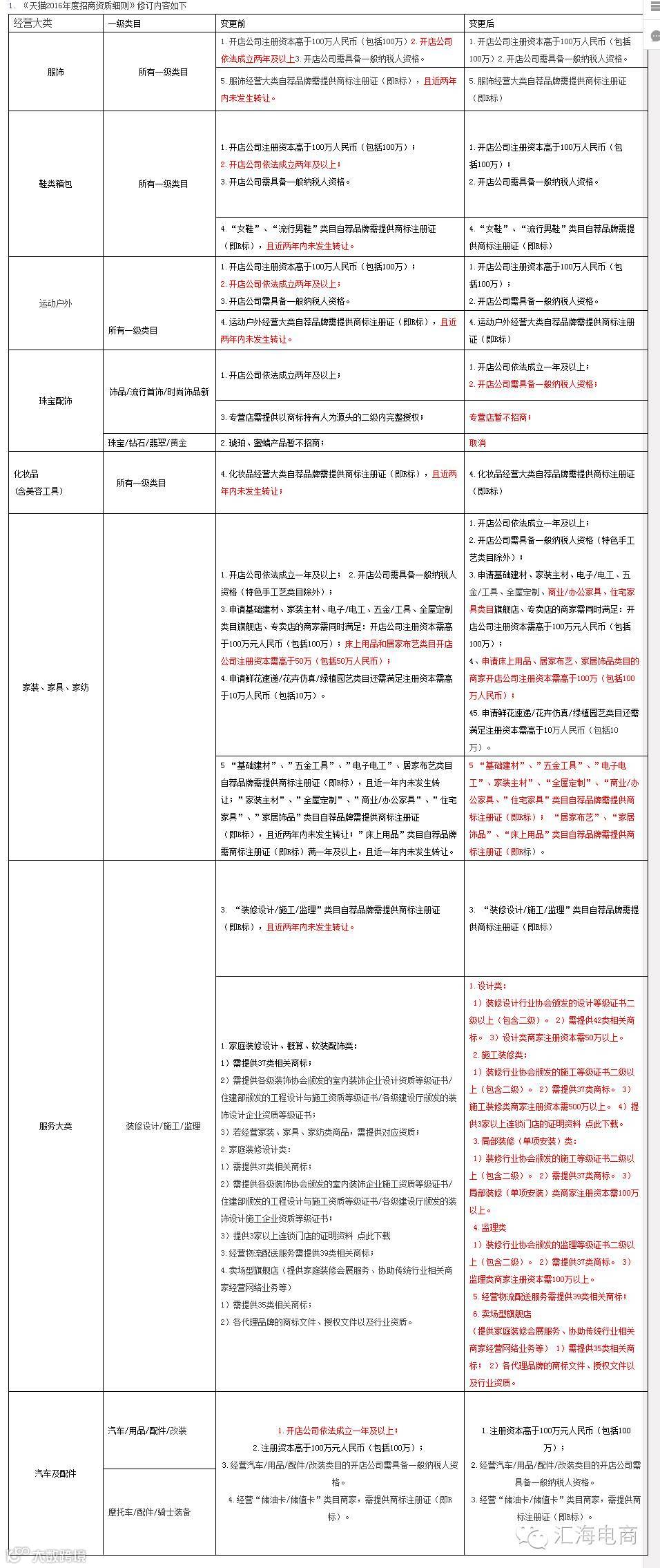 1. 《天猫2016年度招商资质细则》修订内容如下: