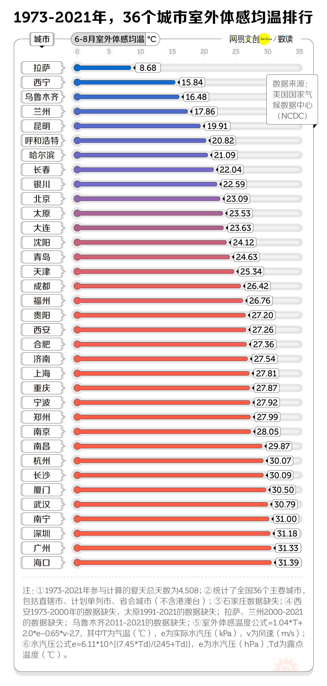 因为,我们选取了全国 36 个主要大中城市,基于新浪微博用户@ 王_晓磊根据美国国家气候数据中心数据整理更新的中国气象历史数据(https://quotsoft.net/air/),我们得出了一份室外体感均温排名。