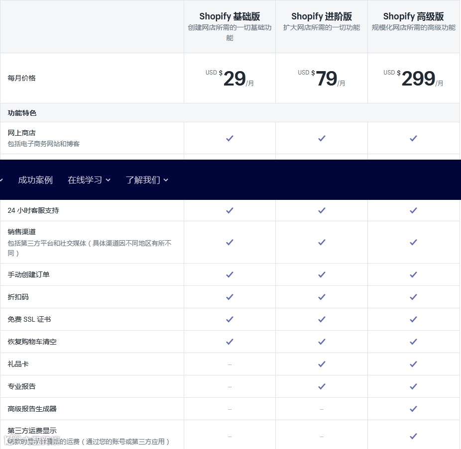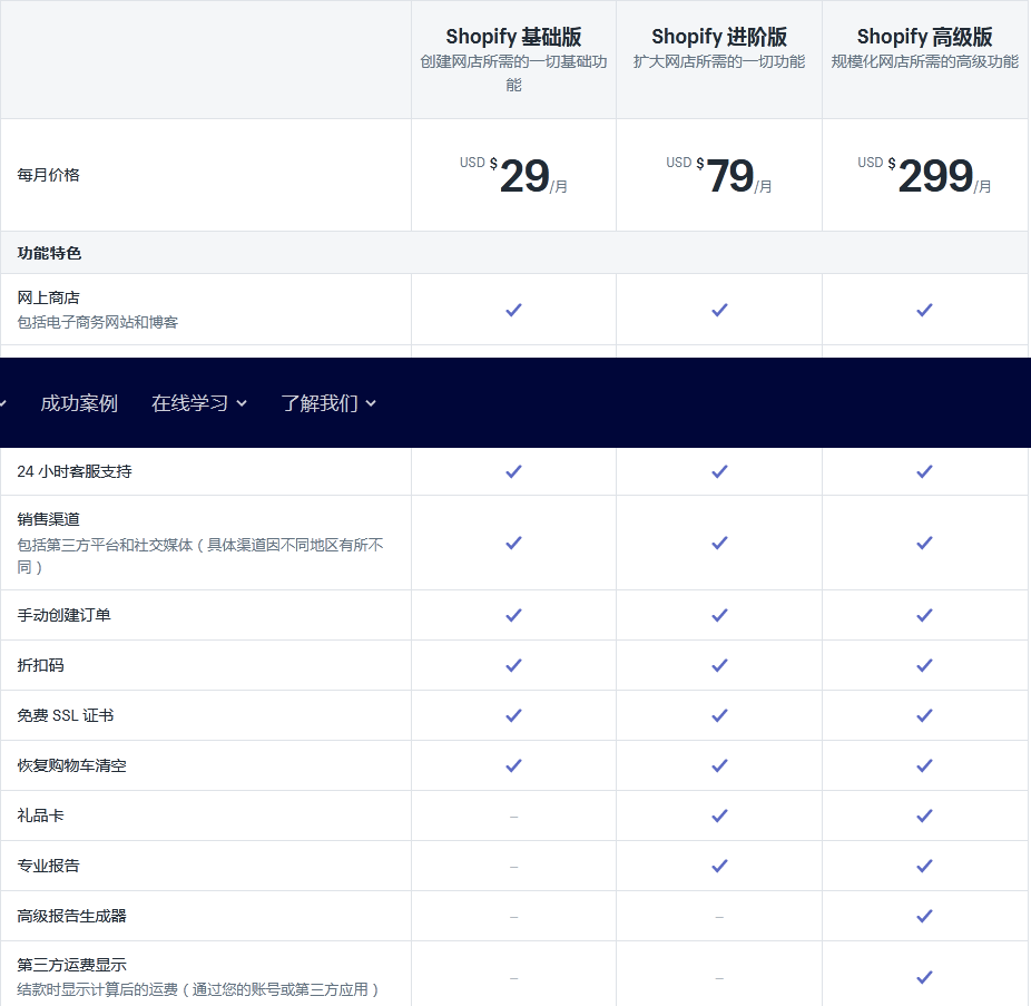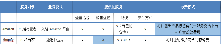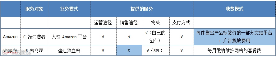下表列出了 Amazon 与 Shopify 在性质、服务内容等方面上的异同。