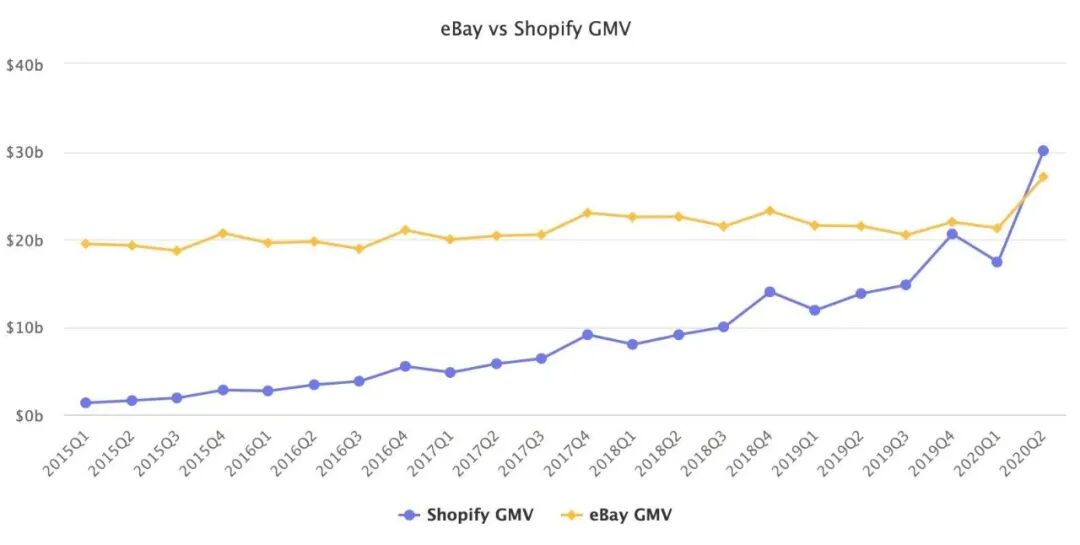 Shopify 于 2006 年成立于渥太华,最初就是为商家提供建站服务,随着电子商务从新鲜事物发展为日常生活的一部分,Shopify 也随之成长,如今已经是一家市值超过 1000 亿美元的上市公司。而在 今年第 2 季度,Shopify 的网站成交总额首次超越 eBay,成为 Amazon 后的美国第二大电商平台。虽然和 Amazon 的市场份额比起来还差得远,但这对 Shopify 本身而言,是一个巨大的突破。
