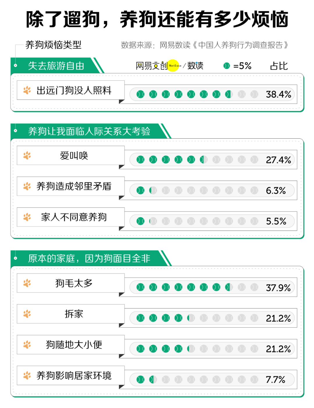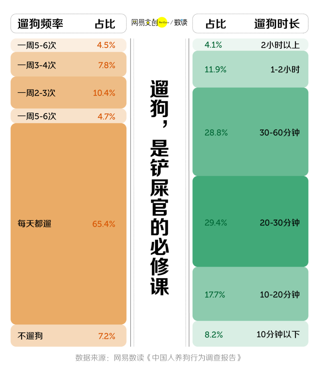 65.4% 的铲屎官每天都需要遛狗,无论是刮风下雨,还是遇到史上最热的夏天,都要雷打不动地带狗出门散步,一路再面对其他人的嘘寒问暖 [2]。