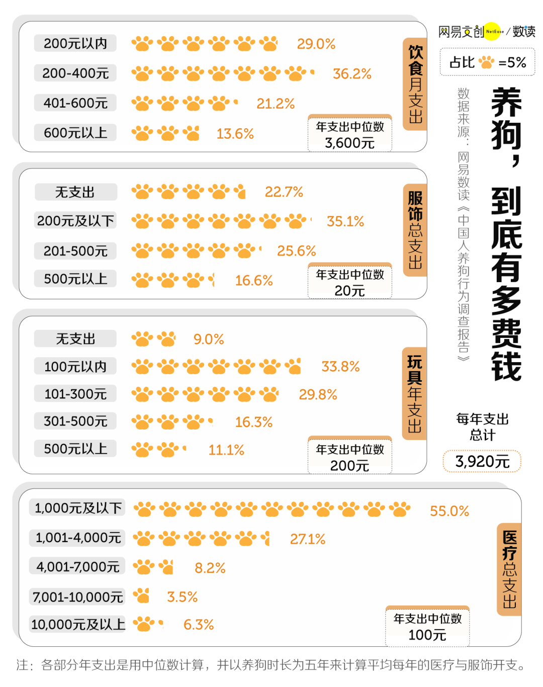 我们的调查显示,养只狗每年的开销约在 4000 元左右,其中绝大多数开销都是狗粮 [2]。