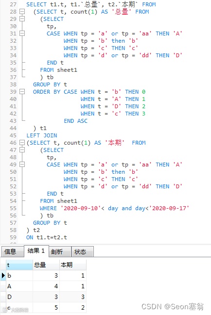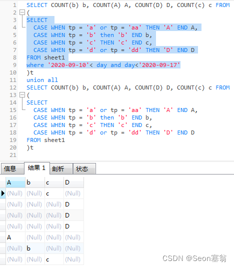 话不多说,直接先看表妹的操作。首先在子查询中通过 where 筛选本期时间段内数据,再利用 case when 对原类别重新归类,对每个新类所在列取个别名,便于下一步计数(子查询结果见下图)。如此再复刻一个不选时间的总体数据后,通过 union all 上下拼接。