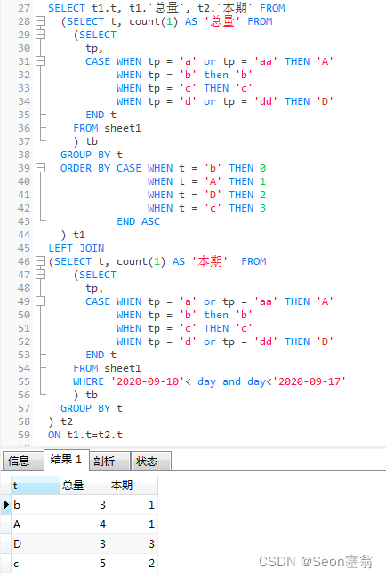 以脱敏数据为例,对 tp 重新归类,原本是 a、aa、b、c、d、dd 六类,先变成 A、b、c、D 四类,并分不同时间段计数,且按指定的新分类顺序 bADc 排序。这个需求源于工作中用到一个 excel 数据模板,格式固定,所以需要查出来的数据能直接复制粘贴到模板表里。应该怎么做呢?