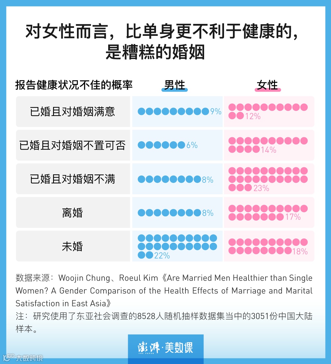 一份基于中日韩三个东亚国家的不同情感状况和健康关系的研究就发现,同样是在不如意的婚姻里,男性的健康状况依旧会好于未婚的男性,而女性则截然相反。在所有情感状态中,遇上糟糕婚姻的女性,有23%的概率会出现健康问题,比未婚女性还高5个百分点。