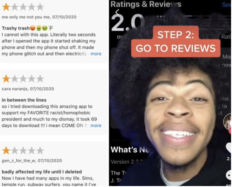 TikTok 上拥有 75 万粉丝的创作者胡安·布克甚至发布了一段视频,教大家如何给特朗普竞选 app 刷差评。这条视频点击率已接近 600 万次。