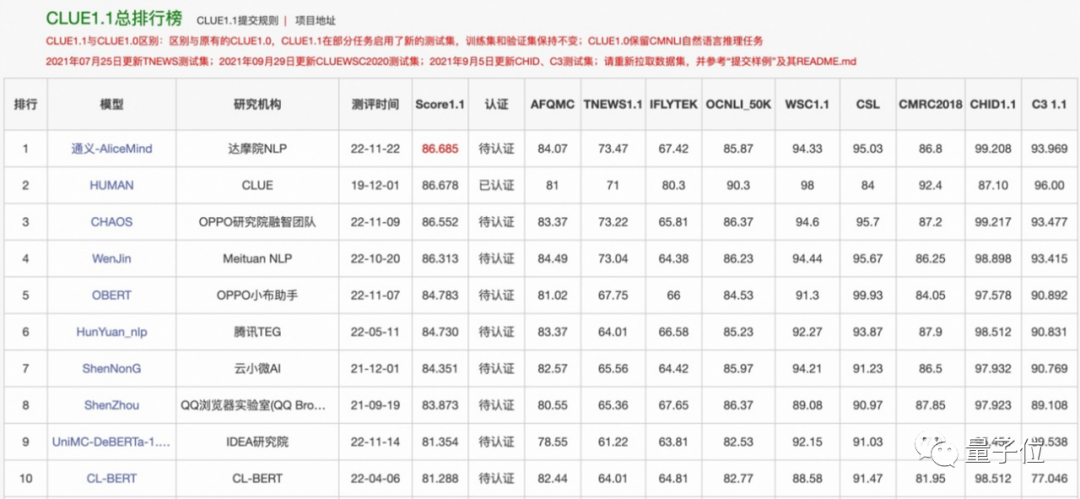 最新中文语言理解领域权威榜单CLUE,诞生了一项新的纪录: