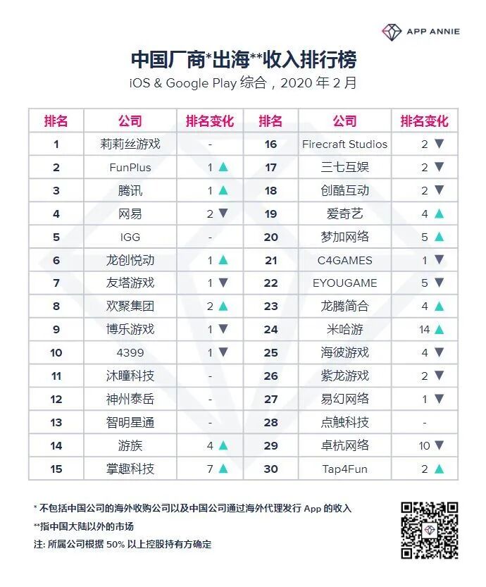 App Annie发布2月份中国厂商出海收入排行榜,前五名分别是:莉莉丝游戏、FunPlus、腾讯、网易、ICG。莉莉丝游戏凭借“AFK剑与远征”在韩国的优质表现继续稳坐出海收入榜单冠军宝座,同时这也是该公司自2019年1月以来首次蝉联榜首。此番强劲势头让其后来居上超过《万国觉醒》成为莉莉丝出海游戏头牌,整体出海收入占比超过50%。