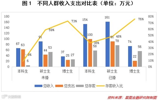 (1)已婚人群存款收入普遍要比未婚人群高,虽然他们支出更多,但收入也在成倍增加。