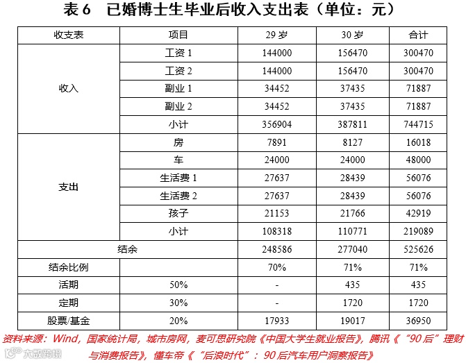 最后来看已婚博士生的收支情况。已婚博士生在毕业2年内,同配偶的总收入接近74万元,总支出为21万元,年均结余率71%,为六类人群中最高,通过每年结余以及理财总收入,最终在30岁双方婚后存款可达56.5万元,婚后平均存款28.2万元。博士由于毕业年龄较大,在未毕业时购房压力较大,故假定这一期间内暂未购房,但博士的稀缺性带来的正向反馈使该类人群具有较强的抗压性、较高的成长性,所以结余比例在6大人群中也是较高的。