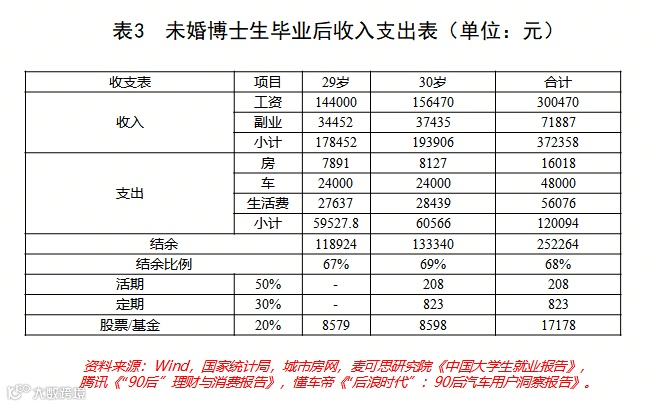 博士由于自身财富积累年限短,在毕业前买房并不现实,所以在毕业时通过租房过渡,并未背上房贷,从而可以得到未婚博士生毕业后的收入支出表。