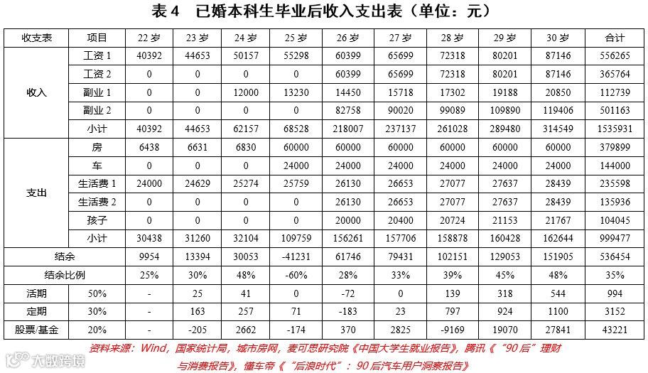1990年出生的本科生在2012年毕业踏入社会,跟据《中国大学生就业报告》《90后理财与消费报告》等的数据显示,当年大学生人均薪酬为3366元/月,在毕业两年后培养自身的副业,但由于限于学历,副业收入假定为1000元/月,结合前文的思路,可得到未婚本科生毕业后的收入支出表。