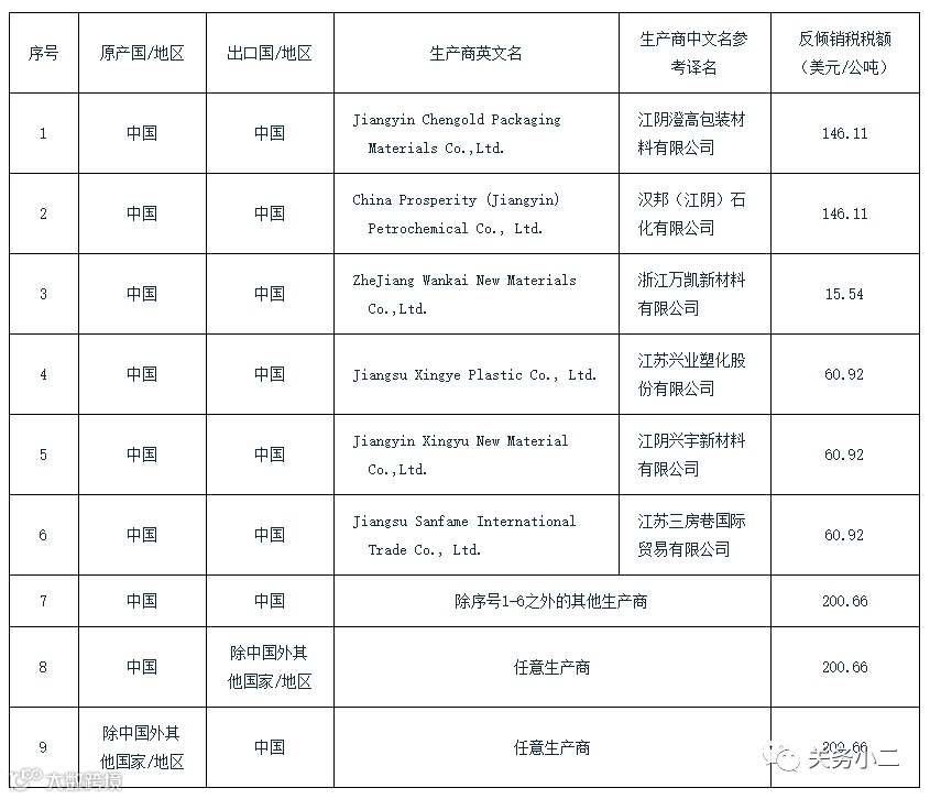 2020年12月28日,印度商工部发布公告称,对原产于或进口自中国的特性粘度≥0.72分升/克的聚对苯二甲酸乙二醇酯树脂(Polyethylene terephthalate resin having an intrinsicviscosity of 0.72 decilitres per gram or higher)作出反倾销肯定性终裁,建议对中国涉案产品征收有效期为5年的反倾销税,税额为15.54~200.66美元/公吨,具体征税详情见附表。涉案产品的印度海关编码为39076910和39076990。