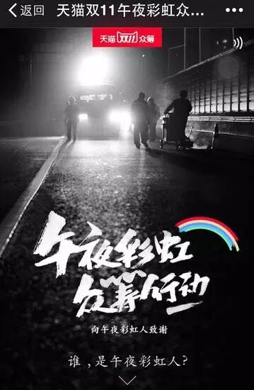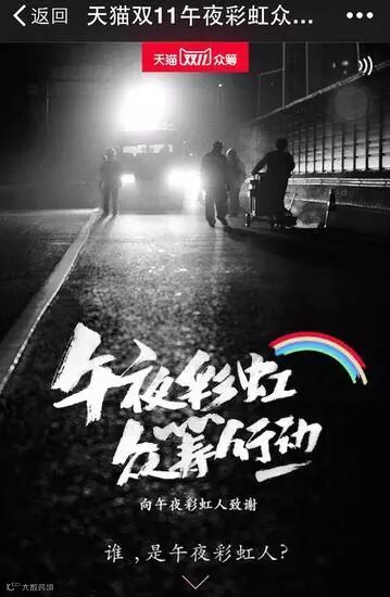 在为天猫商城制作的另一支微信H5中,Karma公司又打出了“感情牌”——将焦点放在了双十一幕后的工作人员,这些在半夜出行的快递运输司机成为了天猫“午夜彩虹 众筹行动”中的主角。天猫希望通过视频内容在微博、微信平台上的传播,让公众对快递员、护士、巡警等夜间职业产生新的认识。