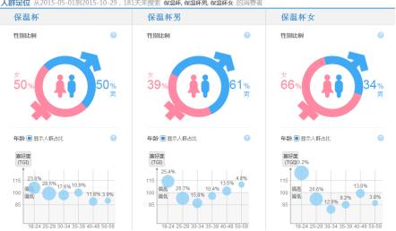 从该图表可以看出搜索“保温杯/保温杯/的男女比例是比较均衡的,不具备特殊的指导意义,喜好度最高的人群集中在25-29岁的年轻段,喜好度次高的人群出现在30-34岁的年龄区间,较为年轻的目标人群和喜好旅游户外运动休闲场合特性决定了本产品详情页的装修风格偏向户外休闲的格调。
