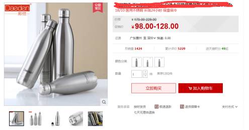 观察购买 保温杯的人群集中度较高的消费层级处于中等偏高,他们更偏向注重产品的品牌和品质。宝贝主图描述时是简单明了 突出产品的质感 标题和页面描述宣传德国进口 较好不锈钢 等这些卖点,以迎合目标人群的需求,让他们通过宝贝描述能清晰认识这个宝贝,打消他们对产品的不信任,促使其购买。