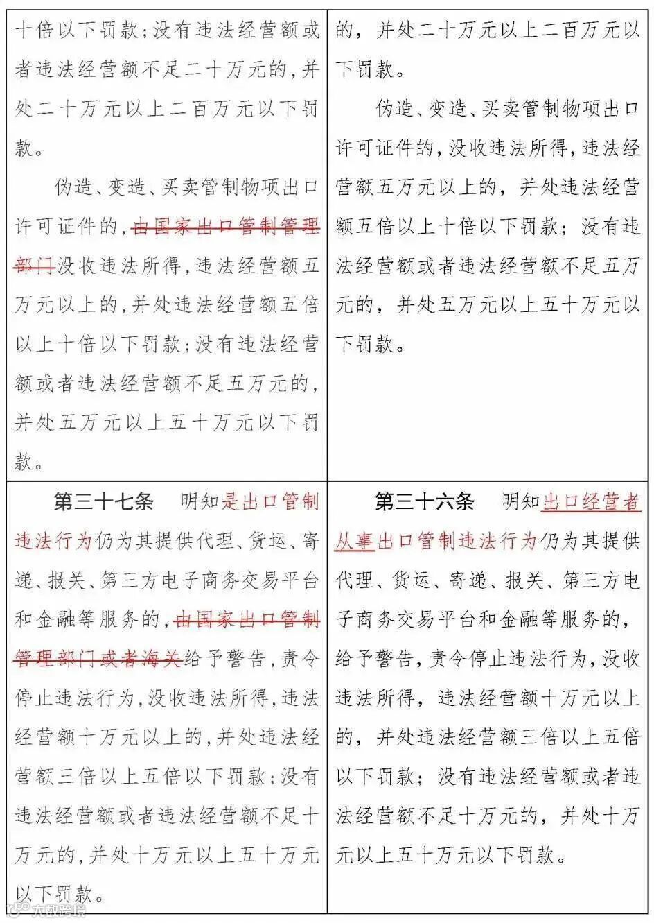 第三十六条 明知出口经营者从事出口管制违法行为仍为其提供代理、货运、寄递、报关、第三方电子商务交易平台和金融等服务的,给予警告,责令停止违法行为,没收违法所得,违法经营额十万元以上的,并处违法经营额三倍以上五倍以下罚款;没有违法经营额或者违法经营额不足十万元的,并处十万元以上五十万元以下罚款。