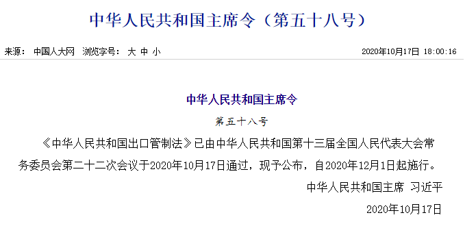 2020年10月13日,十三届全国人大常委会第二十二次会议对出口管制法草案进行第三次审议,并于10月17日通过。